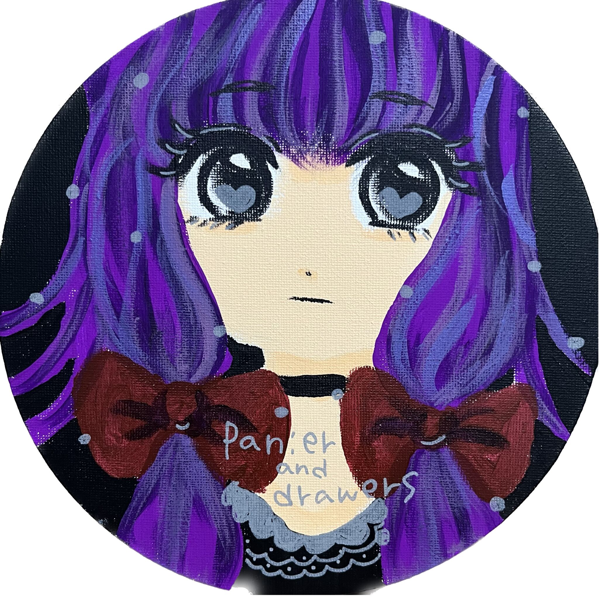 大きなリボンとシルバーな襟が特徴的な女の子です。 20センチのキャンバスです。 襟と文字はポスターカラー、他は全てアクリル絵の具で描いています。